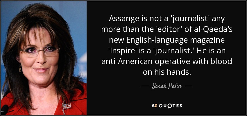 Assange is not a 'journalist' any more than the 'editor' of al-Qaeda's new English-language magazine 'Inspire' is a 'journalist.' He is an anti-American operative with blood on his hands.