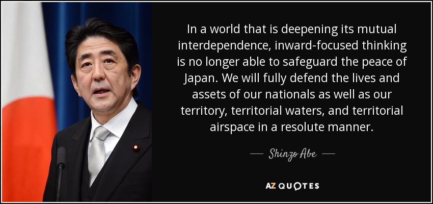 In a world that is deepening its mutual interdependence, inward-focused thinking is no longer able to safeguard the peace of Japan. We will fully defend the lives and assets of our nationals as well as our territory, territorial waters, and territorial airspace in a resolute manner.