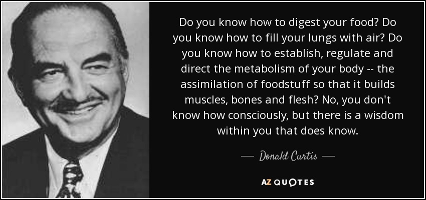 Do you know how to digest your food? Do you know how to fill your lungs with air? Do you know how to establish, regulate and direct the metabolism of your body -- the assimilation of foodstuff so that it builds muscles, bones and flesh? No, you don't know how consciously, but there is a wisdom within you that does know.