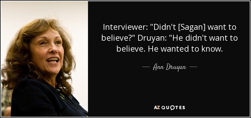 Interviewer: "Didn't [Sagan] want to believe?" Druyan: "He didn't want to believe. He wanted to know.