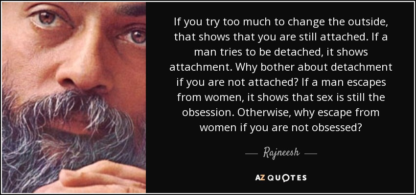 If you try too much to change the outside, that shows that you are still attached. If a man tries to be detached, it shows attachment. Why bother about detachment if you are not attached? If a man escapes from women, it shows that sex is still the obsession. Otherwise, why escape from women if you are not obsessed?