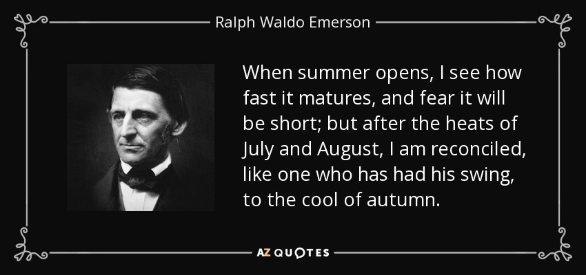 When summer opens, I see how fast it matures, and fear it will be short; but after the heats of July and August, I am reconciled, like one who has had his swing, to the cool of autumn.