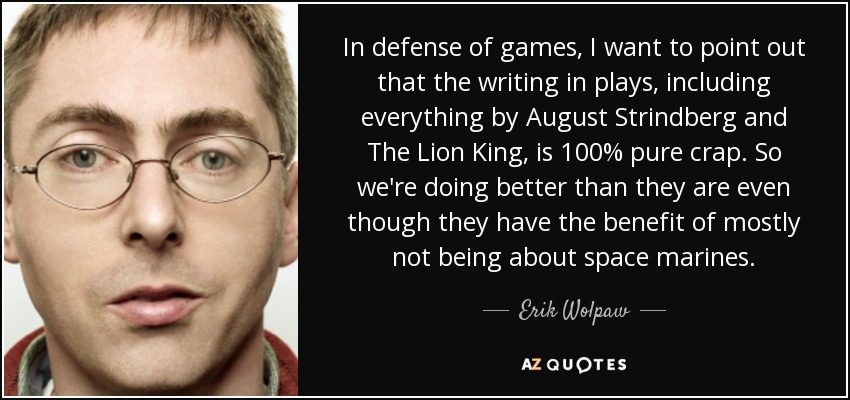 In defense of games, I want to point out that the writing in plays, including everything by August Strindberg and The Lion King, is 100% pure crap. So we're doing better than they are even though they have the benefit of mostly not being about space marines.