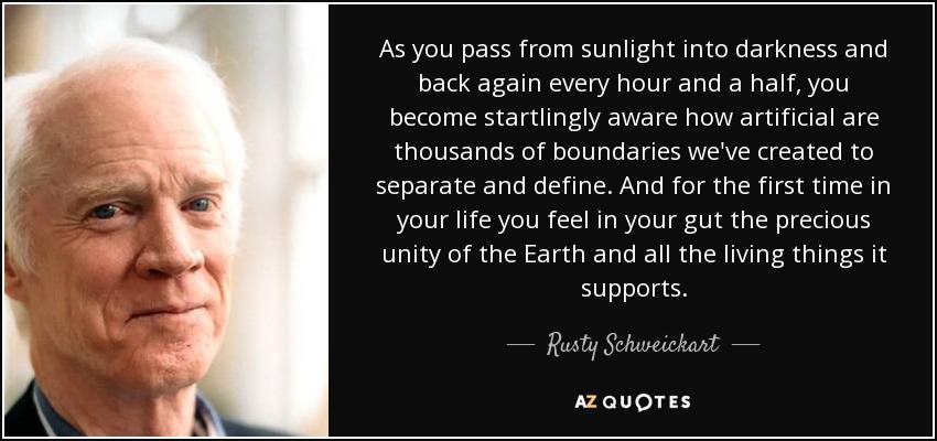 As you pass from sunlight into darkness and back again every hour and a half, you become startlingly aware how artificial are thousands of boundaries we've created to separate and define. And for the first time in your life you feel in your gut the precious unity of the Earth and all the living things it supports.