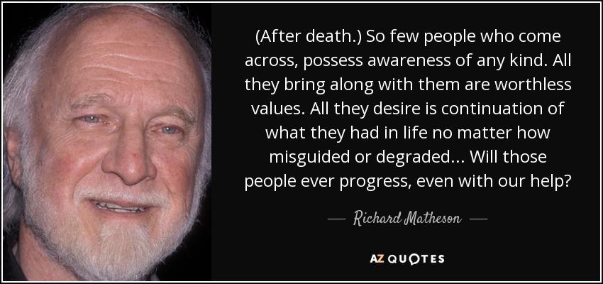 (After death.) So few people who come across, possess awareness of any kind. All they bring along with them are worthless values. All they desire is continuation of what they had in life no matter how misguided or degraded. . . Will those people ever progress, even with our help?