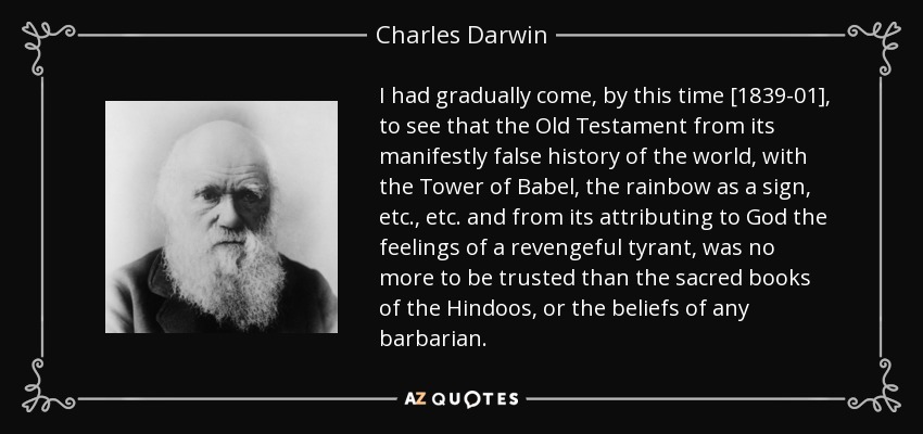 I had gradually come, by this time [1839-01], to see that the Old Testament from its manifestly false history of the world, with the Tower of Babel, the rainbow as a sign, etc., etc. and from its attributing to God the feelings of a revengeful tyrant, was no more to be trusted than the sacred books of the Hindoos, or the beliefs of any barbarian.