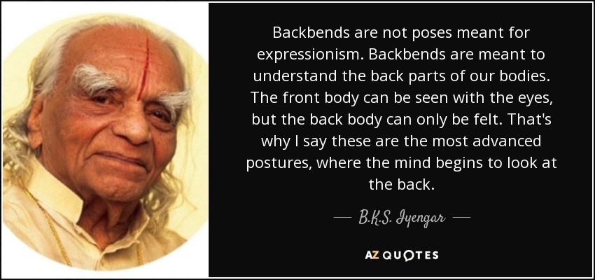 Backbends are not poses meant for expressionism. Backbends are meant to understand the back parts of our bodies. The front body can be seen with the eyes, but the back body can only be felt. That's why I say these are the most advanced postures, where the mind begins to look at the back.