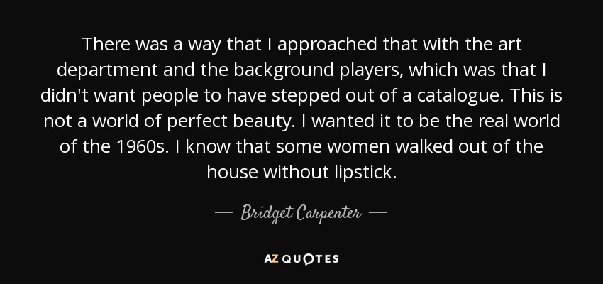 There was a way that I approached that with the art department and the background players, which was that I didn't want people to have stepped out of a catalogue. This is not a world of perfect beauty. I wanted it to be the real world of the 1960s. I know that some women walked out of the house without lipstick.