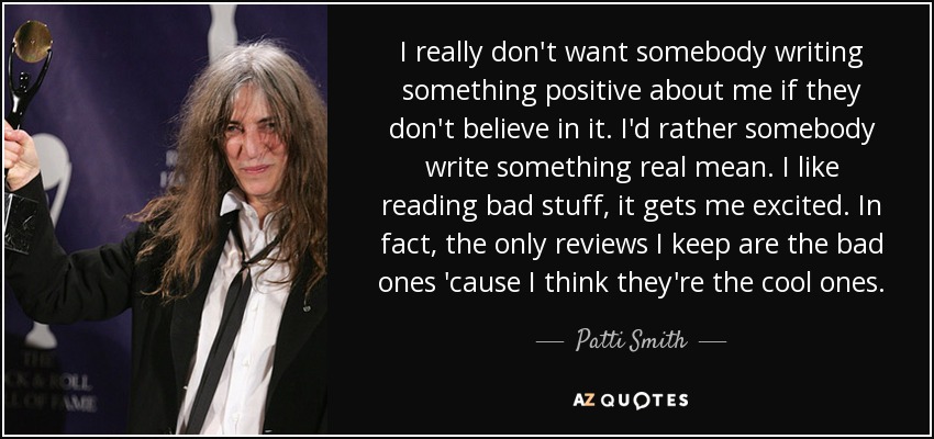 I really don't want somebody writing something positive about me if they don't believe in it. I'd rather somebody write something real mean. I like reading bad stuff, it gets me excited. In fact, the only reviews I keep are the bad ones 'cause I think they're the cool ones.