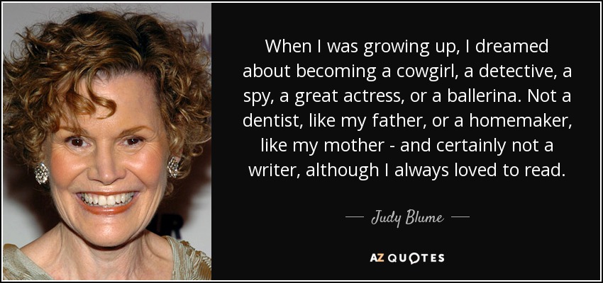 When I was growing up, I dreamed about becoming a cowgirl, a detective, a spy, a great actress, or a ballerina. Not a dentist, like my father, or a homemaker, like my mother - and certainly not a writer, although I always loved to read.