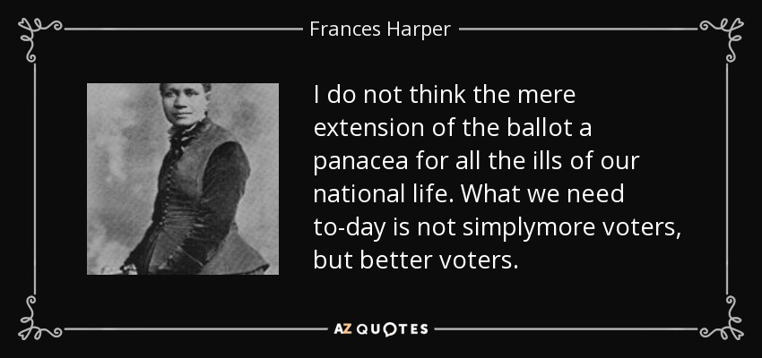 I do not think the mere extension of the ballot a panacea for all the ills of our national life. What we need to-day is not simplymore voters, but better voters.