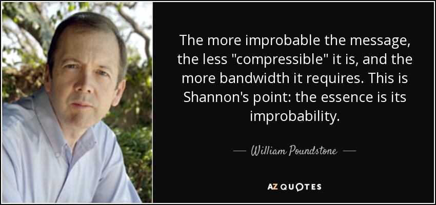 The more improbable the message, the less "compressible" it is, and the more bandwidth it requires. This is Shannon's point: the essence is its improbability.
