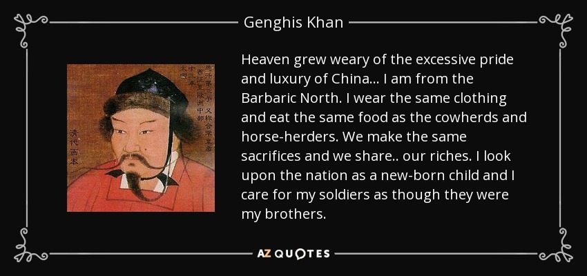 Heaven grew weary of the excessive pride and luxury of China... I am from the Barbaric North. I wear the same clothing and eat the same food as the cowherds and horse-herders. We make the same sacrifices and we share.. our riches. I look upon the nation as a new-born child and I care for my soldiers as though they were my brothers.