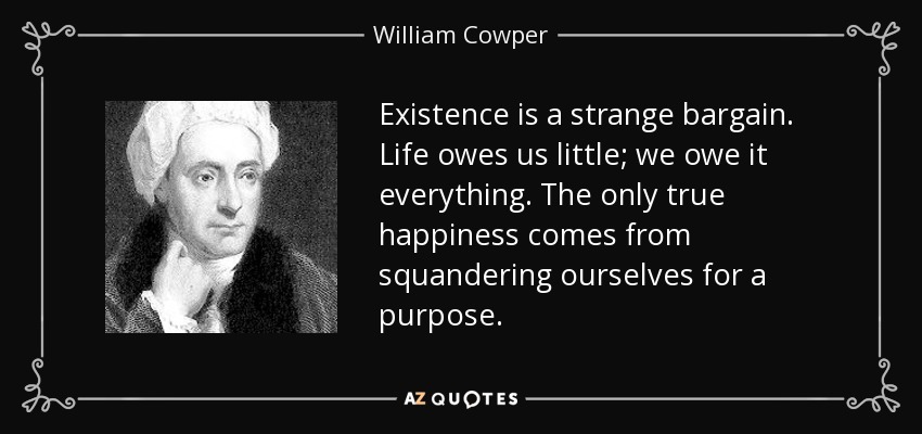 Existence is a strange bargain. Life owes us little; we owe it everything. The only true happiness comes from squandering ourselves for a purpose.