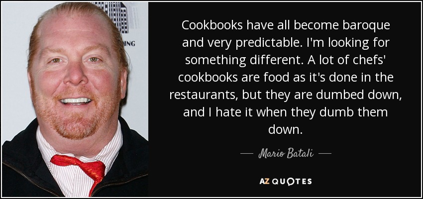 Cookbooks have all become baroque and very predictable. I'm looking for something different. A lot of chefs' cookbooks are food as it's done in the restaurants, but they are dumbed down, and I hate it when they dumb them down.