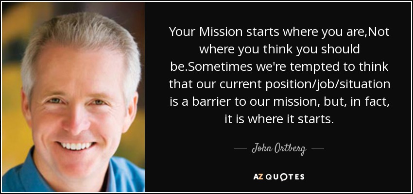 Your Mission starts where you are,Not where you think you should be.Sometimes we're tempted to think that our current position/job/situation is a barrier to our mission, but, in fact, it is where it starts.