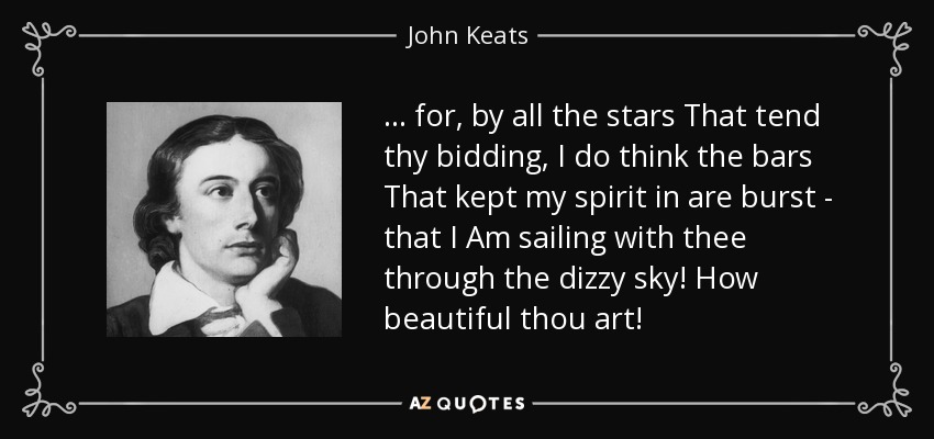 ... for, by all the stars That tend thy bidding, I do think the bars That kept my spirit in are burst - that I Am sailing with thee through the dizzy sky! How beautiful thou art!