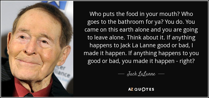 Who puts the food in your mouth? Who goes to the bathroom for ya? You do. You came on this earth alone and you are going to leave alone. Think about it. If anything happens to Jack La Lanne good or bad, I made it happen. If anything happens to you good or bad, you made it happen - right?