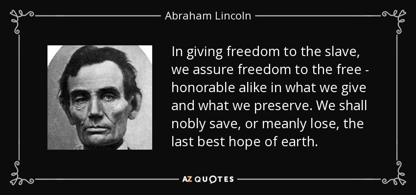 In giving freedom to the slave, we assure freedom to the free - honorable alike in what we give and what we preserve. We shall nobly save, or meanly lose, the last best hope of earth.