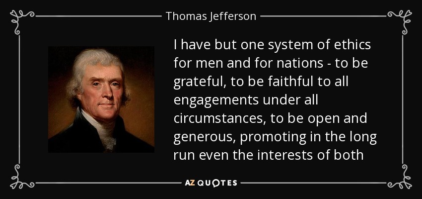 I have but one system of ethics for men and for nations - to be grateful, to be faithful to all engagements under all circumstances, to be open and generous, promoting in the long run even the interests of both