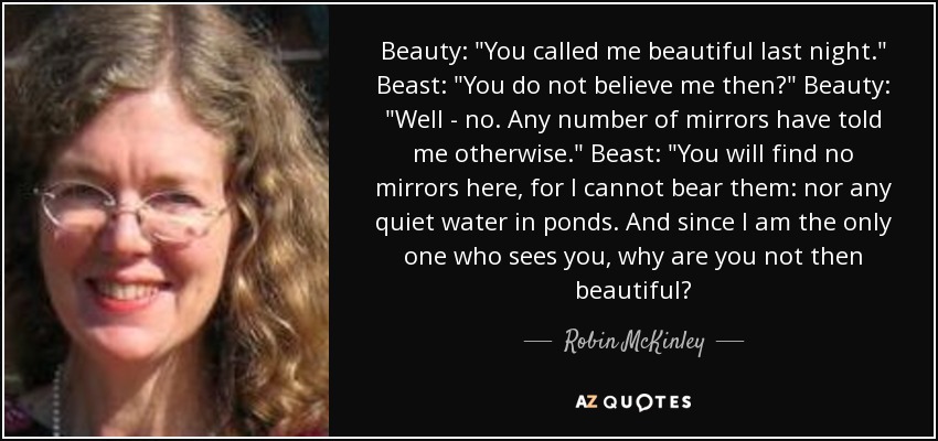 Beauty: "You called me beautiful last night." Beast: "You do not believe me then?" Beauty: "Well - no. Any number of mirrors have told me otherwise." Beast: "You will find no mirrors here, for I cannot bear them: nor any quiet water in ponds. And since I am the only one who sees you, why are you not then beautiful?