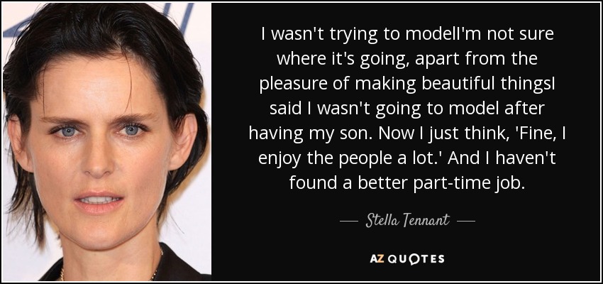 I wasn't trying to modelI'm not sure where it's going, apart from the pleasure of making beautiful thingsI said I wasn't going to model after having my son. Now I just think, 'Fine, I enjoy the people a lot.' And I haven't found a better part-time job.