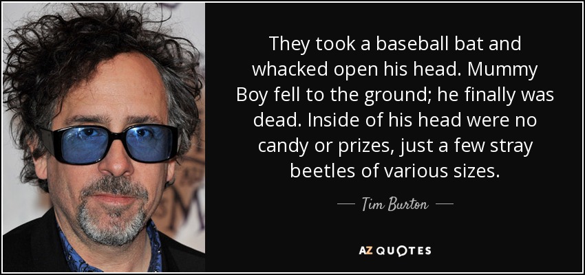 They took a baseball bat and whacked open his head. Mummy Boy fell to the ground; he finally was dead. Inside of his head were no candy or prizes, just a few stray beetles of various sizes.