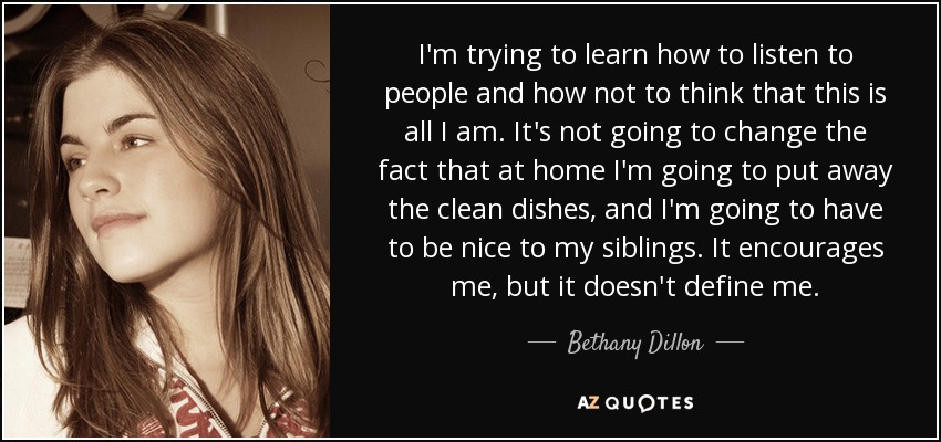 I'm trying to learn how to listen to people and how not to think that this is all I am. It's not going to change the fact that at home I'm going to put away the clean dishes, and I'm going to have to be nice to my siblings. It encourages me, but it doesn't define me.