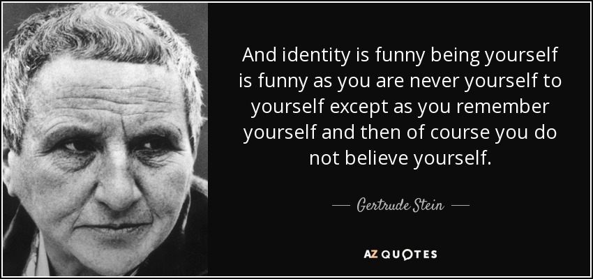 And identity is funny being yourself is funny as you are never yourself to yourself except as you remember yourself and then of course you do not believe yourself.