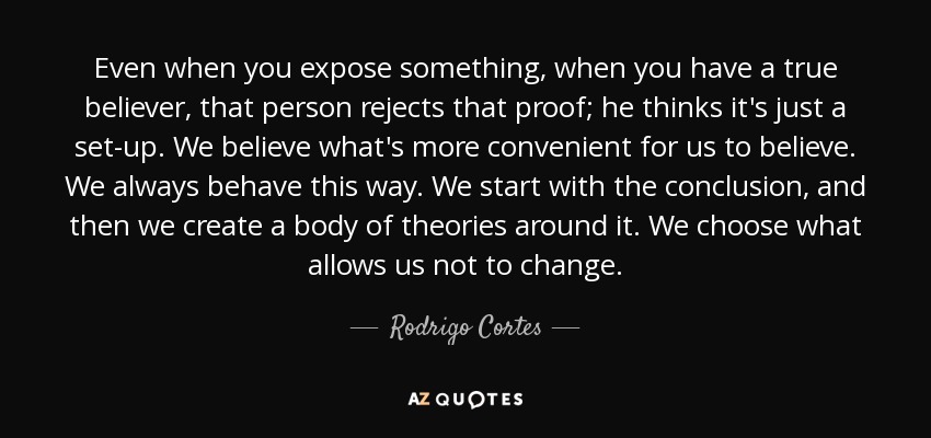 Even when you expose something, when you have a true believer, that person rejects that proof; he thinks it's just a set-up. We believe what's more convenient for us to believe. We always behave this way. We start with the conclusion, and then we create a body of theories around it. We choose what allows us not to change.