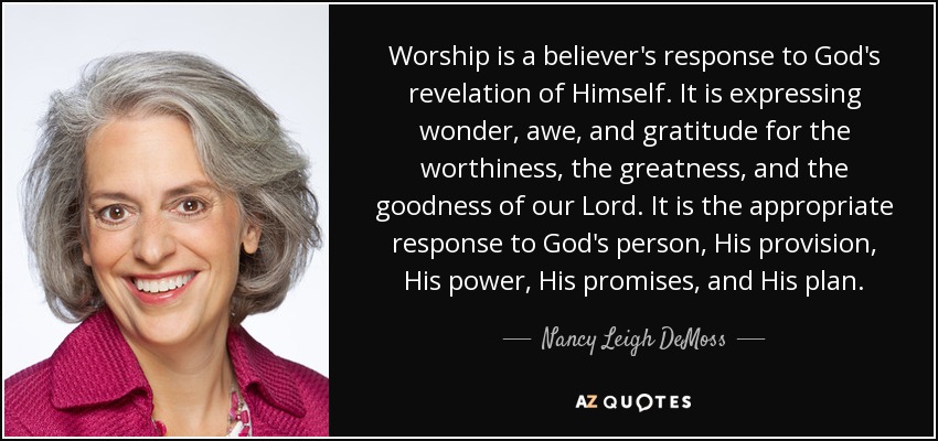 Worship is a believer's response to God's revelation of Himself. It is expressing wonder, awe, and gratitude for the worthiness, the greatness, and the goodness of our Lord. It is the appropriate response to God's person, His provision, His power, His promises, and His plan.