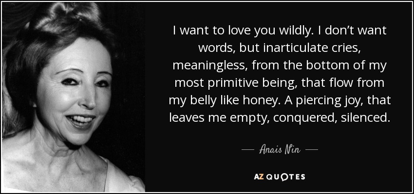 I want to love you wildly. I don’t want words, but inarticulate cries, meaningless, from the bottom of my most primitive being, that flow from my belly like honey. A piercing joy, that leaves me empty, conquered, silenced.