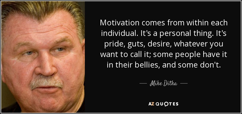 Motivation comes from within each individual. It's a personal thing. It's pride, guts, desire, whatever you want to call it; some people have it in their bellies, and some don't.