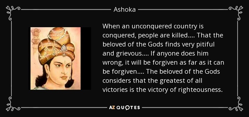When an unconquered country is conquered, people are killed... . That the beloved of the Gods finds very pitiful and grievous. ... If anyone does him wrong, it will be forgiven as far as it can be forgiven... . The beloved of the Gods considers that the greatest of all victories is the victory of righteousness.