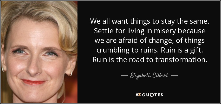 We all want things to stay the same. Settle for living in misery because we are afraid of change, of things crumbling to ruins. Ruin is a gift. Ruin is the road to transformation.