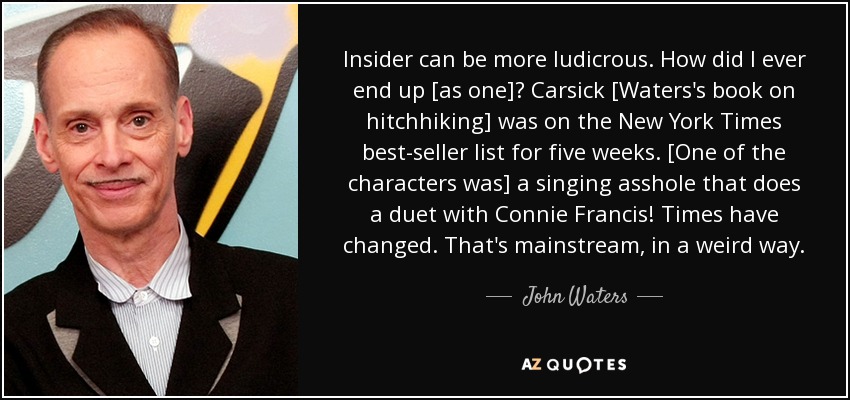 Insider can be more ludicrous. How did I ever end up [as one]? Carsick [Waters's book on hitchhiking] was on the New York Times best-seller list for five weeks. [One of the characters was] a singing asshole that does a duet with Connie Francis! Times have changed. That's mainstream, in a weird way.