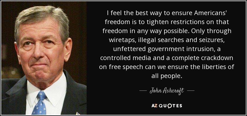 I feel the best way to ensure Americans' freedom is to tighten restrictions on that freedom in any way possible. Only through wiretaps, illegal searches and seizures, unfettered government intrusion, a controlled media and a complete crackdown on free speech can we ensure the liberties of all people.