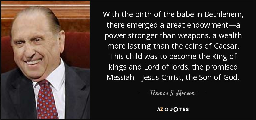 With the birth of the babe in Bethlehem, there emerged a great endowment—a power stronger than weapons, a wealth more lasting than the coins of Caesar. This child was to become the King of kings and Lord of lords, the promised Messiah—Jesus Christ, the Son of God.