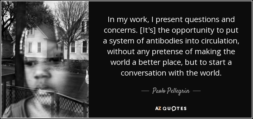 In my work, I present questions and concerns. [It's] the opportunity to put a system of antibodies into circulation, without any pretense of making the world a better place, but to start a conversation with the world.