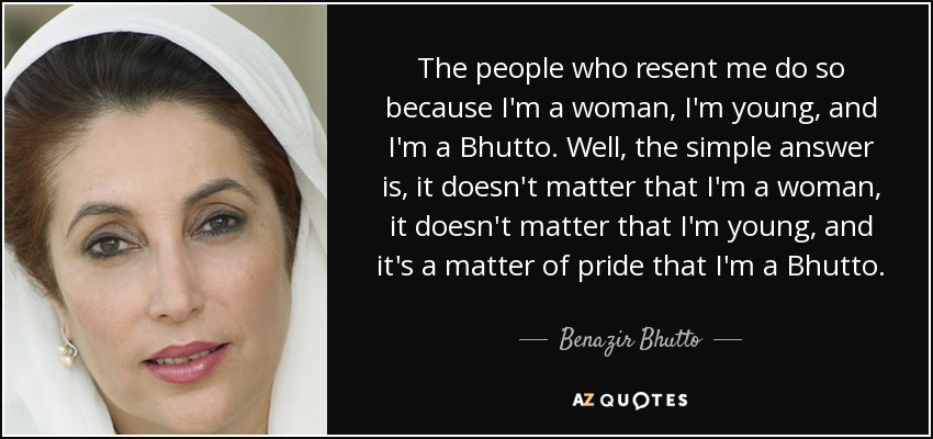 The people who resent me do so because I'm a woman, I'm young, and I'm a Bhutto. Well, the simple answer is, it doesn't matter that I'm a woman, it doesn't matter that I'm young, and it's a matter of pride that I'm a Bhutto.