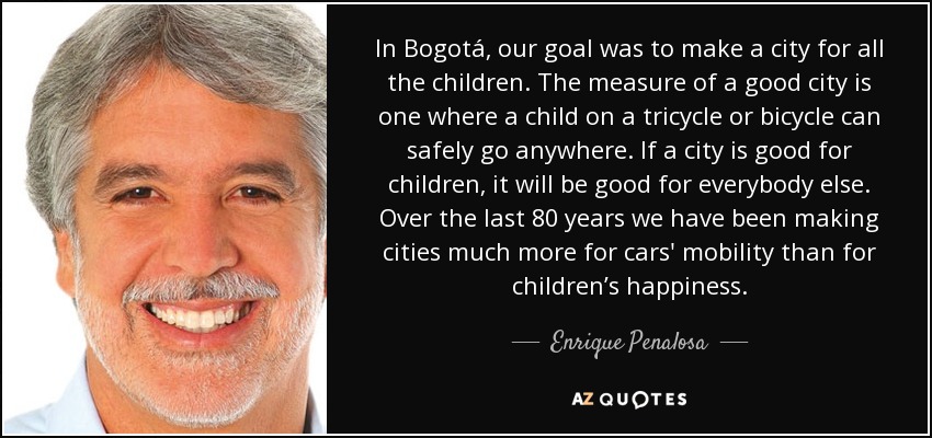 In Bogotá, our goal was to make a city for all the children. The measure of a good city is one where a child on a tricycle or bicycle can safely go anywhere. If a city is good for children, it will be good for everybody else. Over the last 80 years we have been making cities much more for cars' mobility than for children’s happiness.