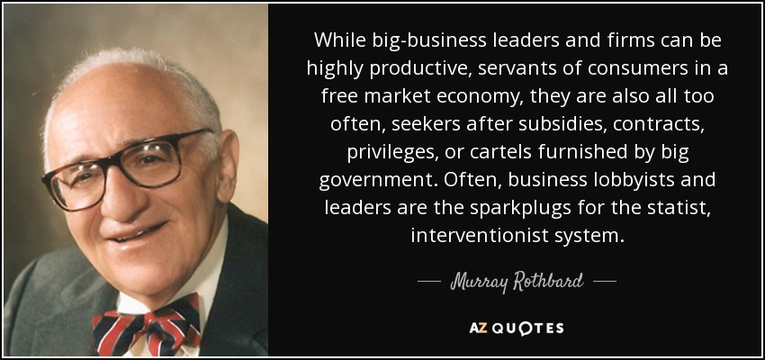 While big-business leaders and firms can be highly productive, servants of consumers in a free market economy, they are also all too often, seekers after subsidies, contracts, privileges, or cartels furnished by big government. Often, business lobbyists and leaders are the sparkplugs for the statist, interventionist system.