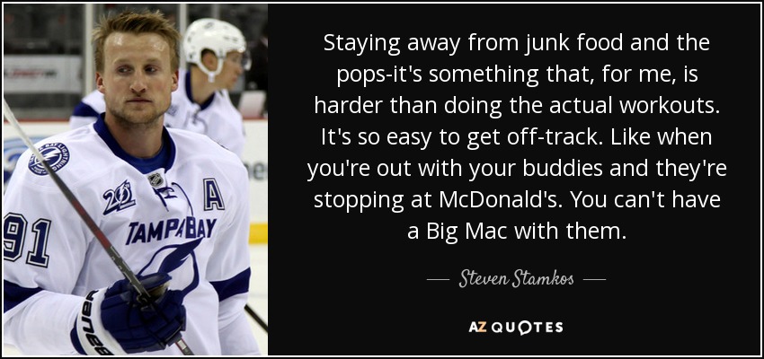 Staying away from junk food and the pops-it's something that, for me, is harder than doing the actual workouts. It's so easy to get off-track. Like when you're out with your buddies and they're stopping at McDonald's. You can't have a Big Mac with them.