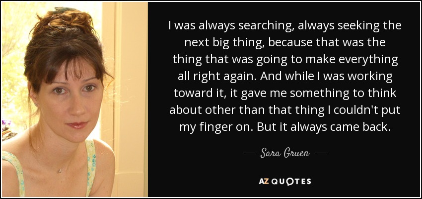 I was always searching, always seeking the next big thing, because that was the thing that was going to make everything all right again. And while I was working toward it, it gave me something to think about other than that thing I couldn't put my finger on. But it always came back.