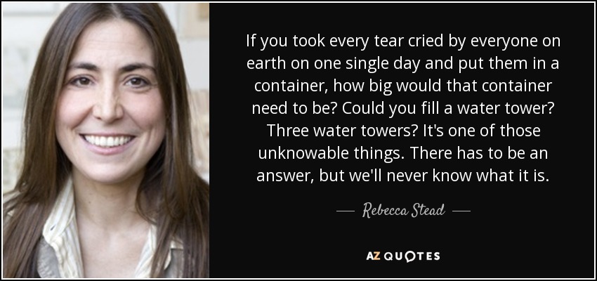 If you took every tear cried by everyone on earth on one single day and put them in a container, how big would that container need to be? Could you fill a water tower? Three water towers? It's one of those unknowable things. There has to be an answer, but we'll never know what it is.