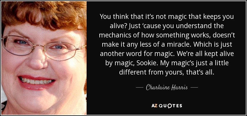 You think that it’s not magic that keeps you alive? Just ‘cause you understand the mechanics of how something works, doesn’t make it any less of a miracle. Which is just another word for magic. We’re all kept alive by magic, Sookie. My magic’s just a little different from yours, that’s all.