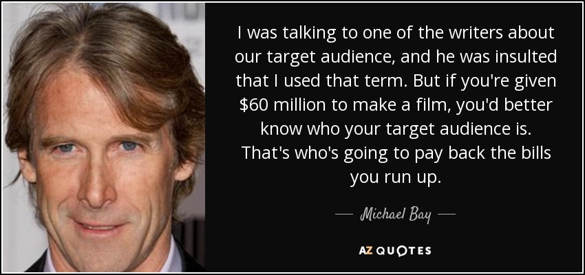 I was talking to one of the writers about our target audience, and he was insulted that I used that term. But if you're given $60 million to make a film, you'd better know who your target audience is. That's who's going to pay back the bills you run up.