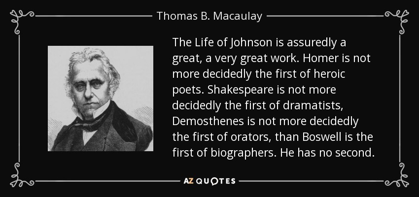 The Life of Johnson is assuredly a great, a very great work. Homer is not more decidedly the first of heroic poets. Shakespeare is not more decidedly the first of dramatists, Demosthenes is not more decidedly the first of orators, than Boswell is the first of biographers. He has no second.