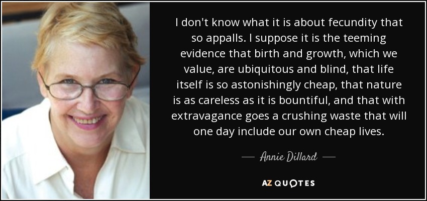 I don't know what it is about fecundity that so appalls. I suppose it is the teeming evidence that birth and growth, which we value, are ubiquitous and blind, that life itself is so astonishingly cheap, that nature is as careless as it is bountiful, and that with extravagance goes a crushing waste that will one day include our own cheap lives.