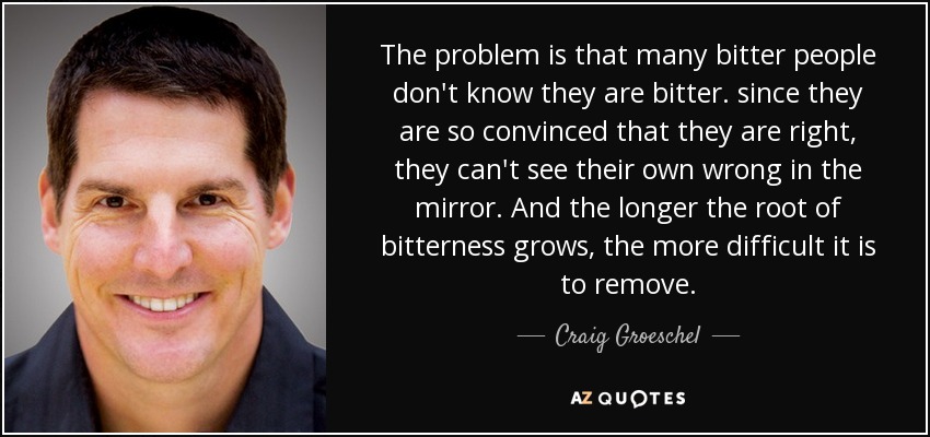 The problem is that many bitter people don't know they are bitter. since they are so convinced that they are right, they can't see their own wrong in the mirror. And the longer the root of bitterness grows, the more difficult it is to remove.